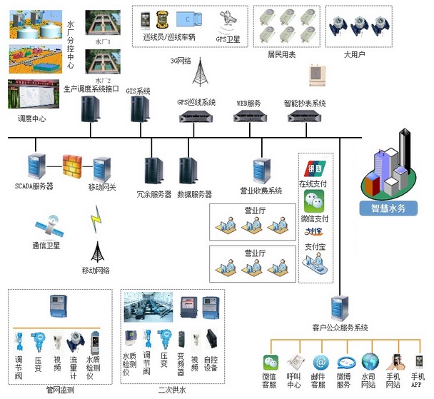 該系統是一種以基于物聯網的一體化綜合管理信息平臺為核心,結合數學仿真模型建立計算機智慧輔助決策的智慧管理系統,系統涵蓋云計算數據中心、水質檢測、指揮排澇、污水處理、自來水生產調度管理、水務智慧安防和水務運營等功能。系統包含:GIS系統、GPS巡檢系統、SCADA系統、視頻監控系統、客戶服務管理系統、網上營業廳系統等系統。其中,基于物聯網技術的云計算水務數據中心分別于其他子系統緊密連接,從而消除了以往水務各個管理系統信息資源不能共享的弊端,降低了運行成本,實現了辦公自動化、數據一體化、流程整合化、策劃科學化,以精細、動態、智能的方式進行水務管理、服務、決策工作,使水務管理達到智慧狀態。