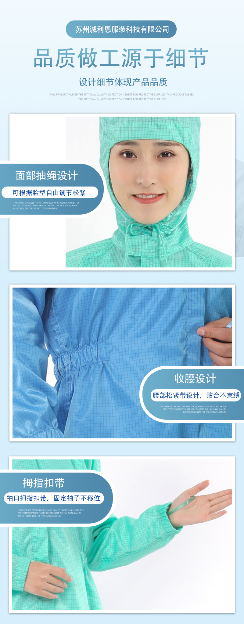 產品性能優勢:潔凈防塵、阻隔粉塵顆粒物、耐高壓濕熱滅菌、永久防靜電、立體剪裁、不起球、布面光潔