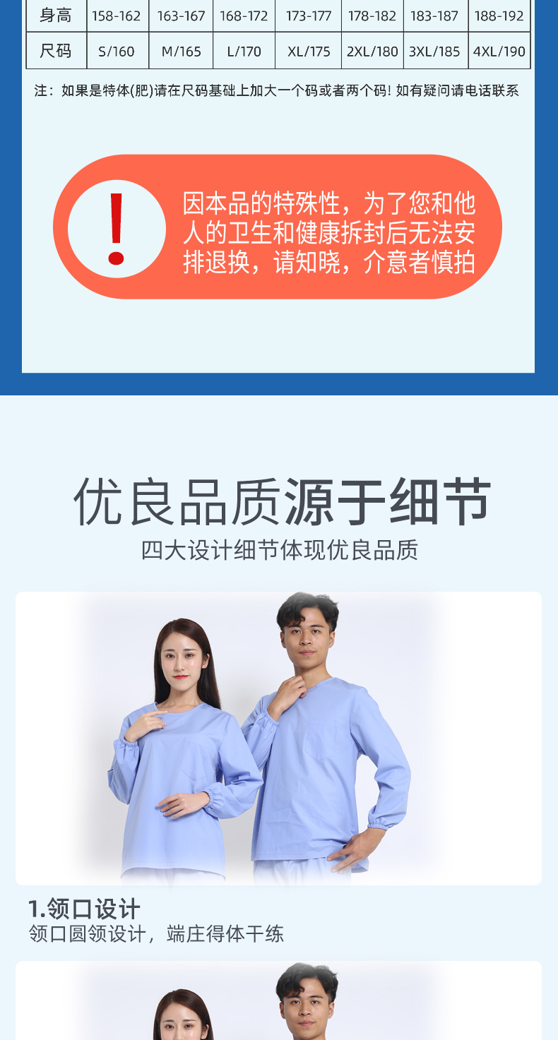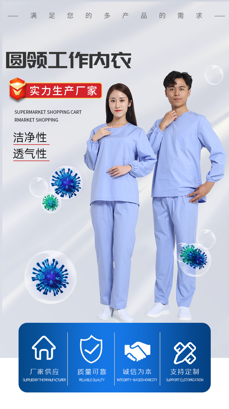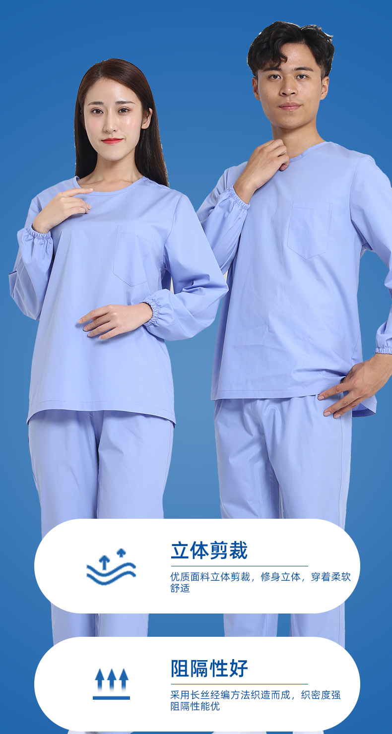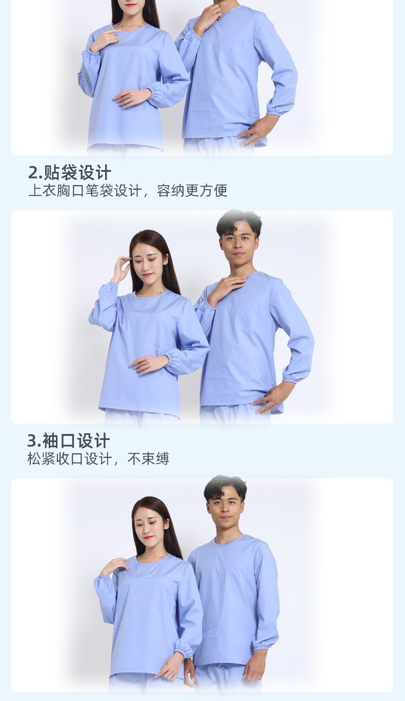 產(chǎn)品優(yōu)勢(shì):產(chǎn)品立體裁剪,分圓領(lǐng)和V領(lǐng)、長(zhǎng)袖、短袖等款式。手腕和腳口處松緊設(shè)計(jì),不束縛更貼合身體,使穿著更舒適。